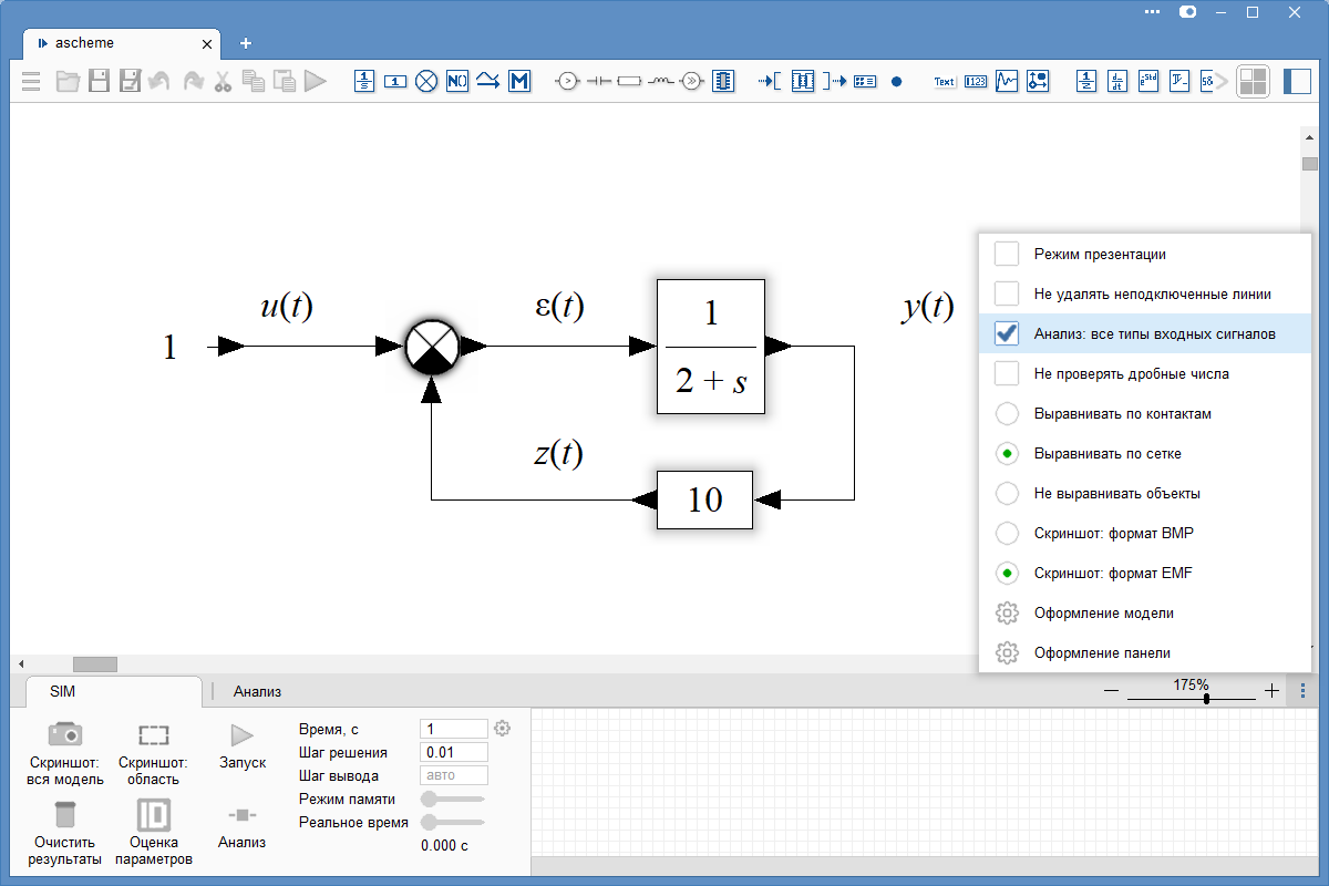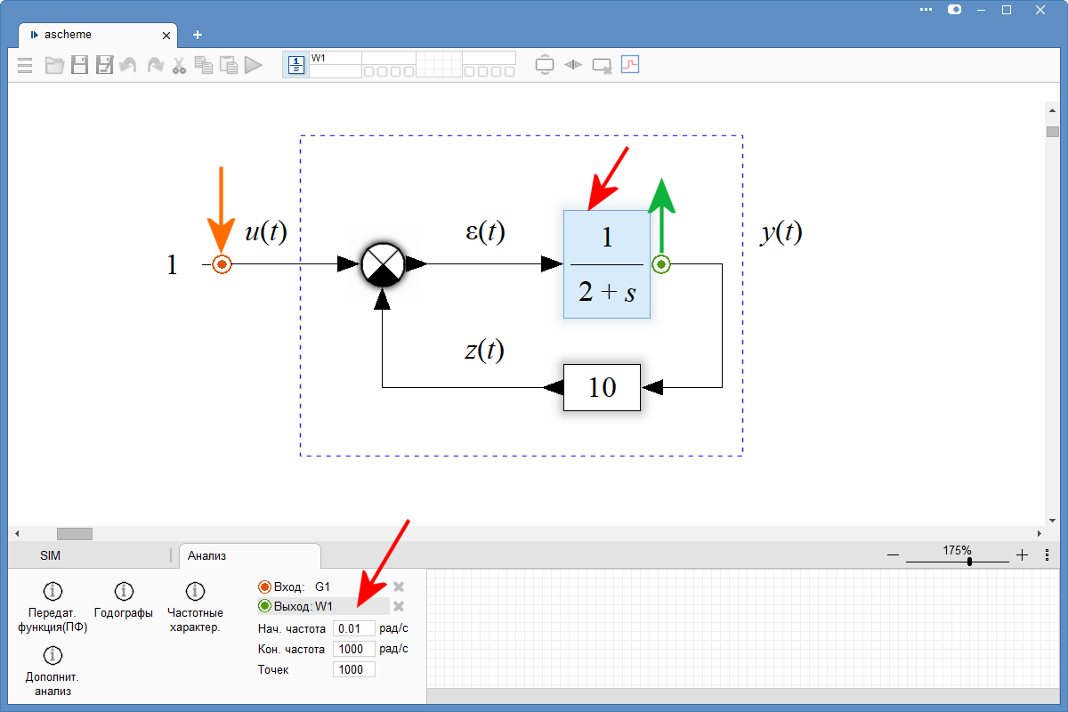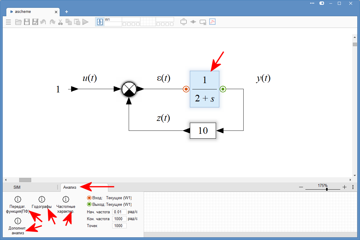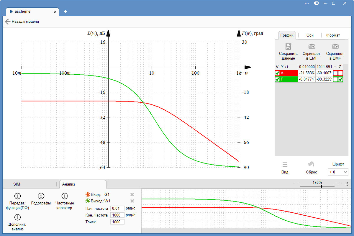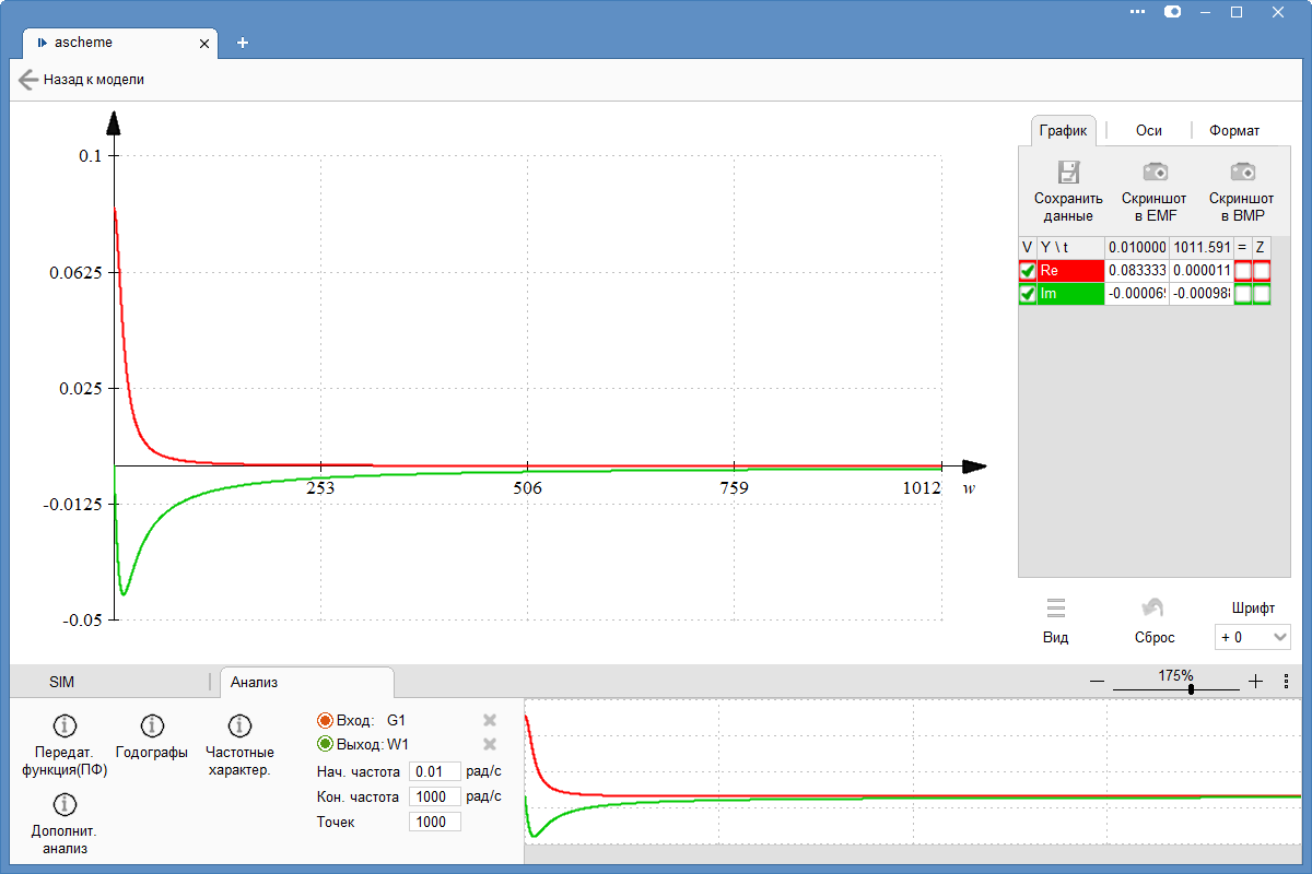 После этого на схеме выделяется звено, на выходе которого формируется выходной сигнал исследуемой системы. Далее в меню выбирается тип выполняемой процедуры анализа - получение передаточной функции системы на этом участке, построение годографа Найквиста или Михайлова, получения ЛАЧХ, ЛФЧХ или ЛАФЧХ, получение действительной Re(w) и мнимой Im(w) частей передаточной функции в частотной области, а также графическое отображение корней.