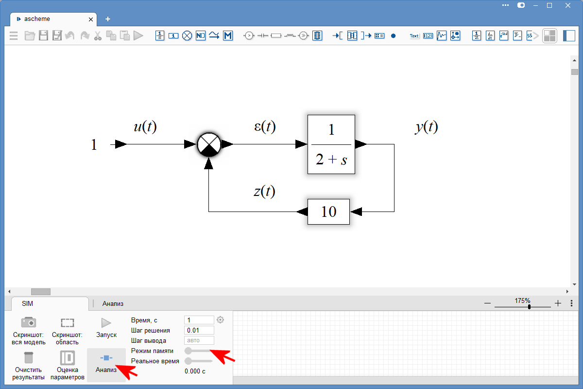 Для того, чтобы построить несколько графиков для разных параметров системы на одном графике, необходимо на вкладке "SIM" включить режим памяти "M".
