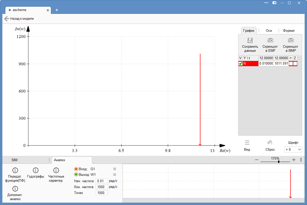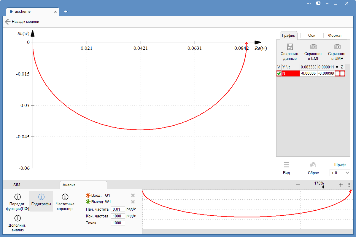 Для получения годографа Найквиста на вкладке "Анализ" выбирается меню "Г-ф Найквиста".