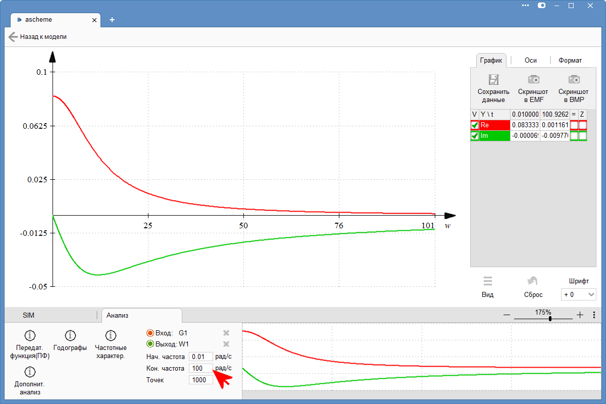 Для того, чтобы изменить диапазон и качество построения графиков, на вкладке "Анализ" необходимо задать начальную и конечную частоты, а также указать количество точек, по которым строится графики.
